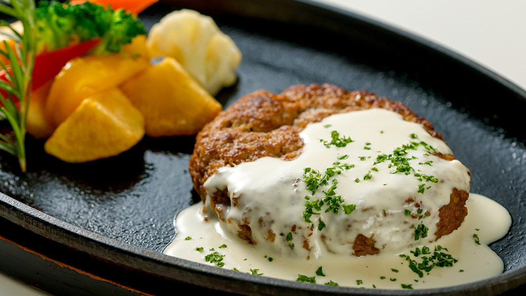 旨味たっぷりの和牛とあぐー豚をふっくらジューシーに焼き上げたハンバーグに、コクのあるクリームチーズソースを合わせたボリューム満点の一品です。