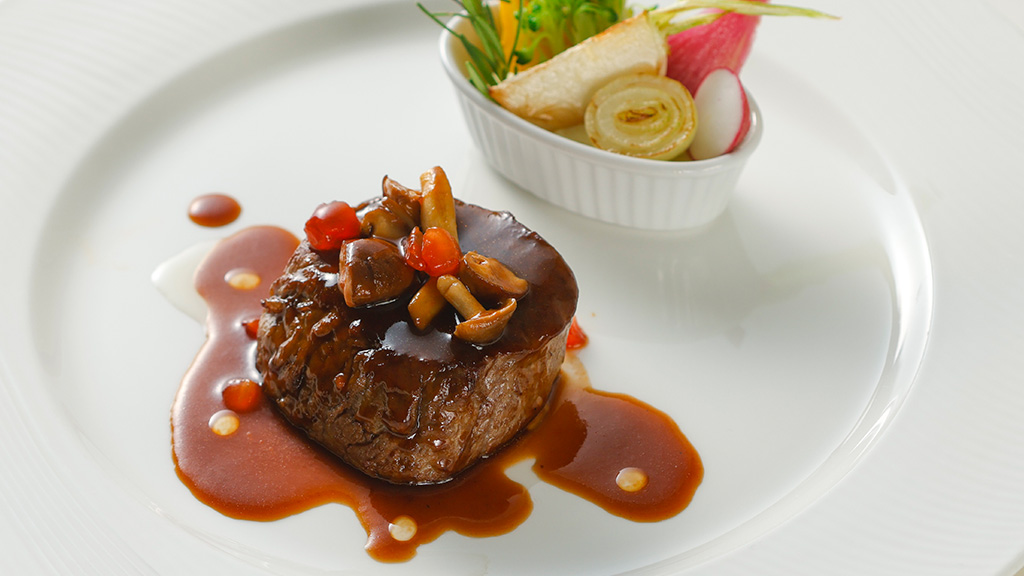 脂身が少なく柔らかな牛フィレ肉をポワレにしました。芳醇な赤ワインソースとキノコの香り、食感が楽しめるシャスールソースでご堪能ください。