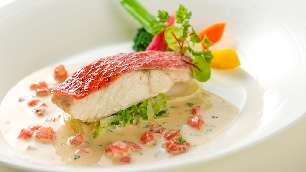 白ワインでふんわりと蒸した白身魚に、シークヮーサーもろみ酢のまろやかな酸味を加えたクリーミーなヴァンブランソースでお楽しみください。