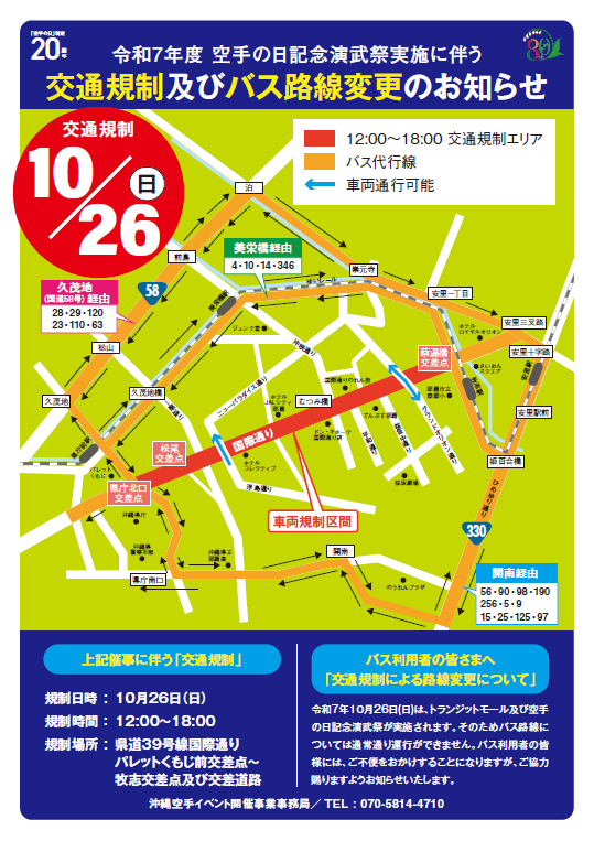 10月26日(日)、「空手の日記念演武祭」開催に伴い、国際通りにて交通規制が実施されます。