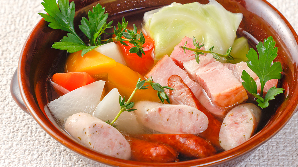 ベーコン、沖縄県産ソーセージ、野菜をコトコト煮込みました。心も体も温まる1品です。