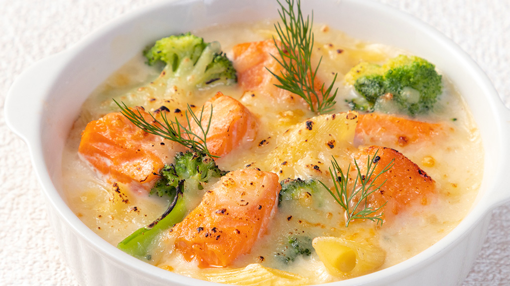 サーモン、ペンネ、野菜をホワイトソースでからめチーズをのせこんがりと焼き上げました。素材の味わいとチーズの濃厚さをご堪能ください。