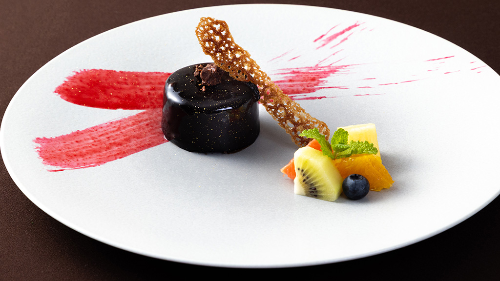 ショコラムースに黒糖のアクセント フルーツと黒糖のチュイルを添えて
