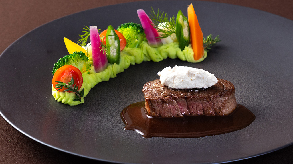 国産牛フィレ肉のポワレ 彩り野菜の菜園仕立て もろみ酢風味の赤ワインソースに玉那覇味噌のクリームフェテと共に