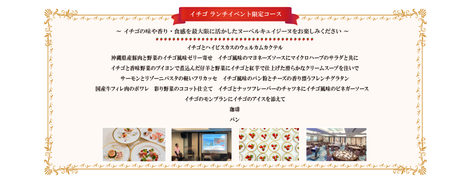 イチゴを使ったフルコースを召し上がりながら、イチゴにまつわる楽しいお話をお楽しみいただけるランチイベント!沖縄県最大規模のイチゴ狩り観光農園やスイーツ専門店を展開している「美らイチゴ」とホテルJAL シティ那覇のコラボレーション企画です。農家さんから直接イチゴのお話や、シェフから料理のお話を聞き、イチゴの魅力を存分に楽しみながら、午後のひと時、ゆったりと過ごしませんか。