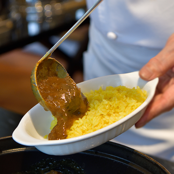 お客様の目の前で料理を仕上げるシェフズコーナーでは沖縄県産和牛をじっくりと柔らかく煮込みました。肉の旨味を引き立てるよう調味したスパイスとの絶妙なハーモニーをお楽しみください。
