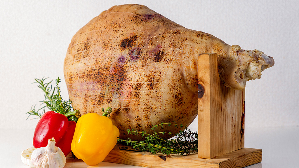母の日限定メニューワゴンコーナーにて、柔らかい沖縄県産骨付き豚モモ肉を蒸して、こんがりと焼き目をつけた「沖縄県産骨付きモモ肉の蒸し焼き」を提供